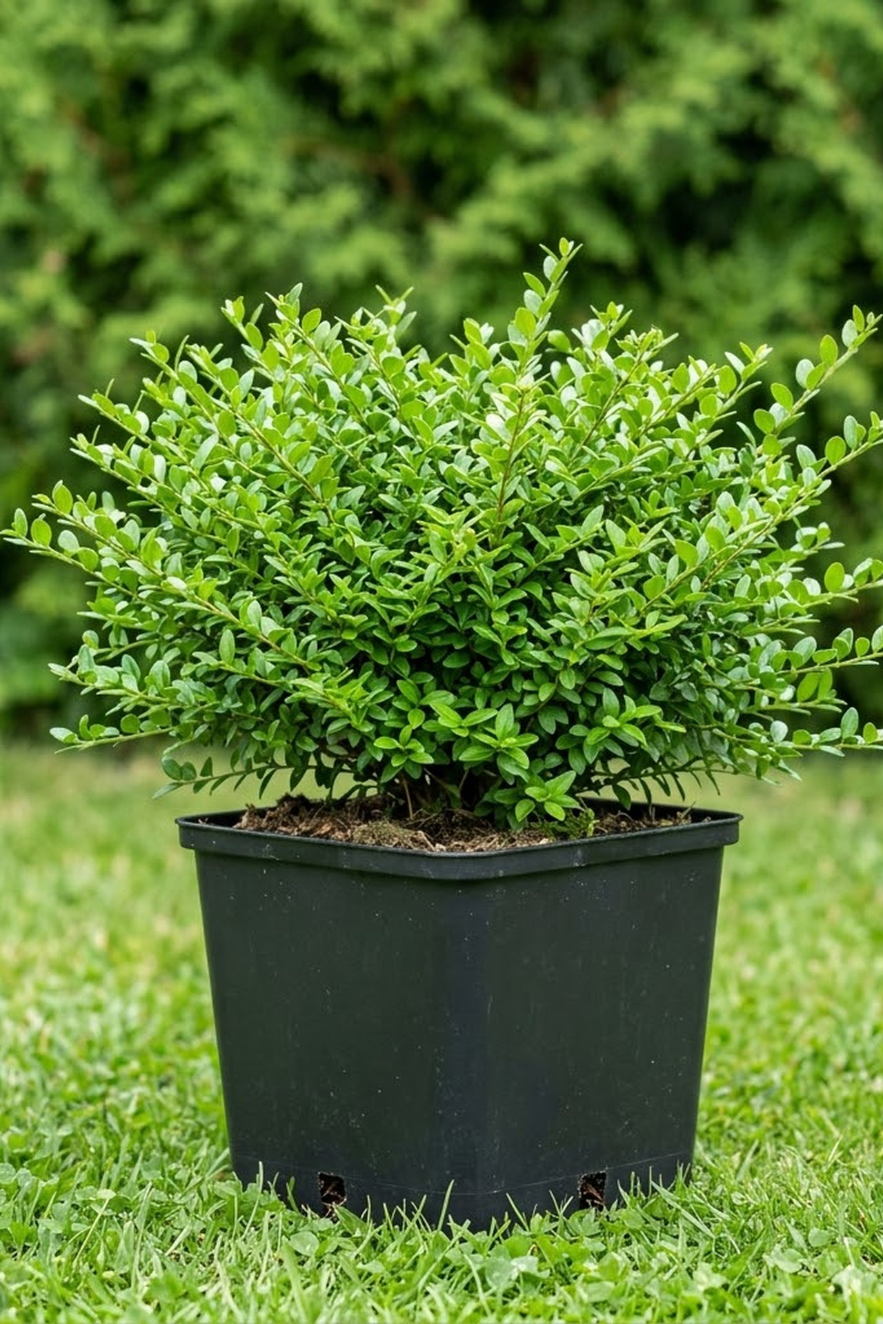 Вечнозеленый ширококустистый густоразветвленный и компактный небольшой кустарник высотой и шириной 1м, ветви вертикальнорастущие, боковые ветви с тонкими светло зелеными побегами бугообразно отклонены, листья вечнозеленые расположены супротивно, небольшие, яйцевидные, двурядные ярко зеленые.