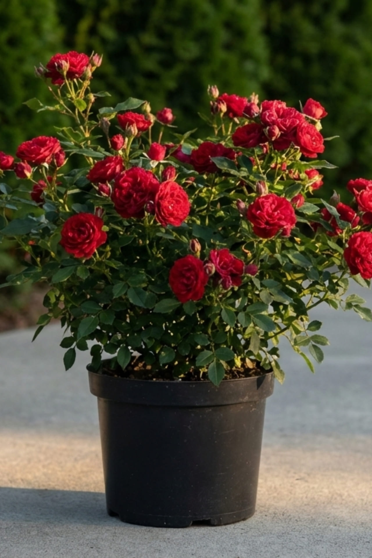 Ярко-красные, умеренно-махровые цветки, на побегах как одиночные, так и в небольших соцветиях. Куст компактный, с темно-зеленой, глянцевой листвой.