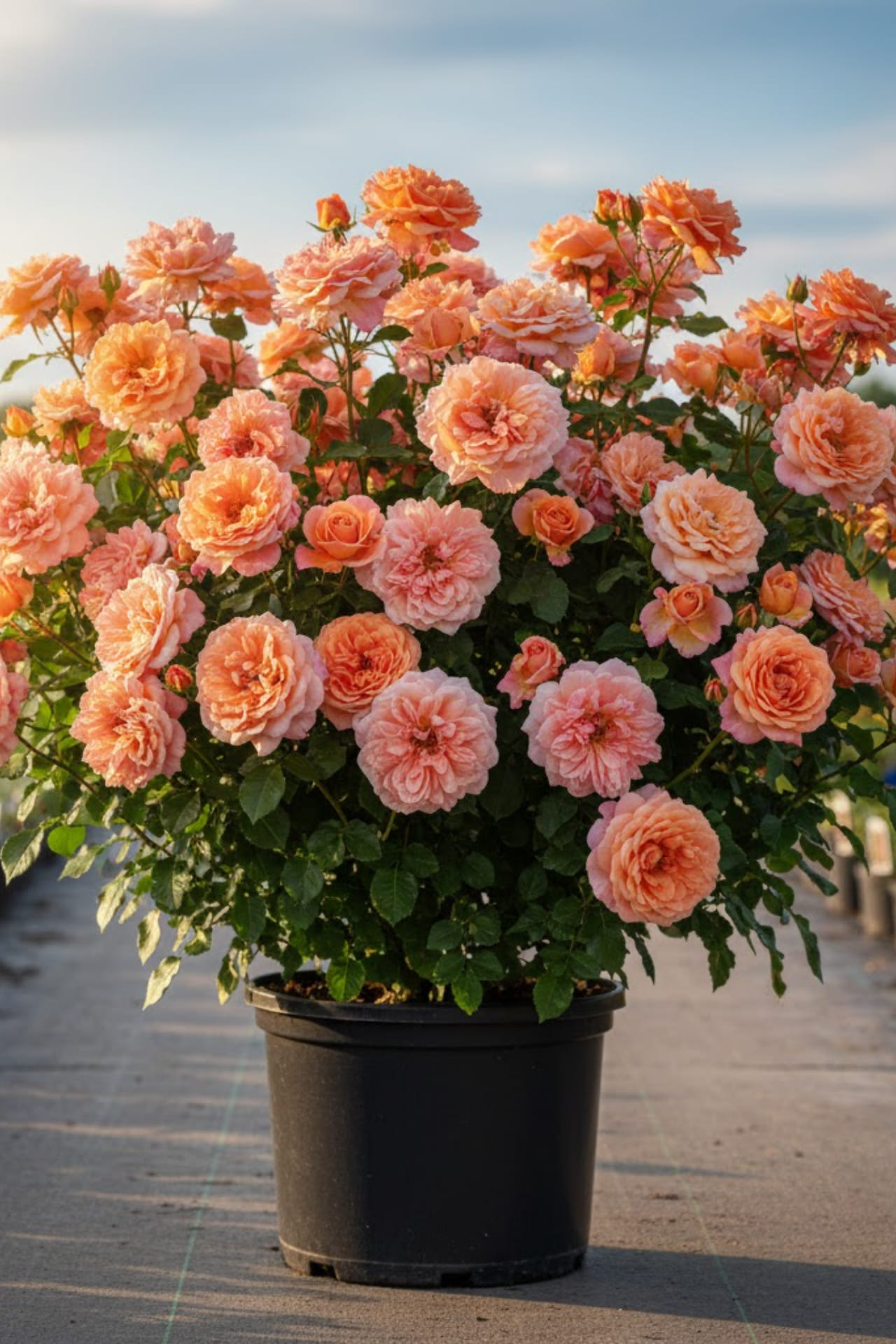 - необычно крупными цветками до 12-15 см. в диаметре. Цветки абрикосово-желтые на солнце оранжево-розового цвета (до 41 лепестка в цветке). Цветки имеют сильный фруктовый аромат.
